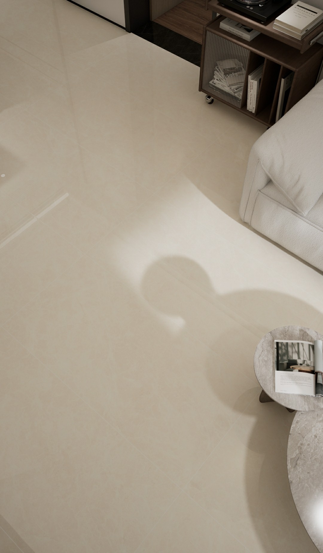 灵感源于地中海沿岸被朝霞浸染的象牙米黄砂岩。海浪与晨雾万年雕琢,岩层渐次沉淀出柔和的米黄色调,深色细纹如同象牙自然微裂的脉络,在细腻肌理中交织延展,如晨曦穿透薄雾的温柔笔触。