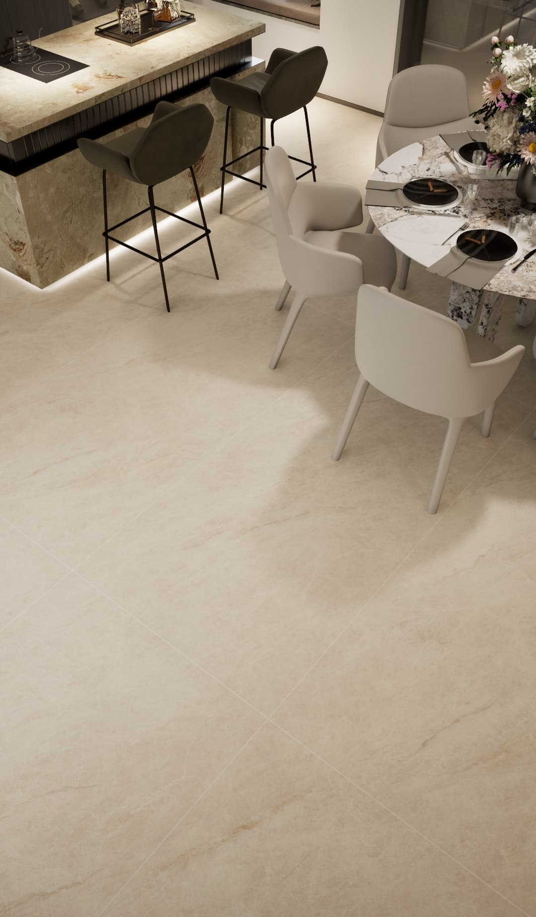 以柔和的米白色为基调,纹理如自然石材的细腻肌理,浅淡的纹路似山水晕染,质朴且富有质感。铺贴后呈现出温润雅致的视觉效果,为空间营造出静谧舒适的氛围,是打造现代简约或新中式风格家居的理想选择,让家在纯净中尽显自然韵味。