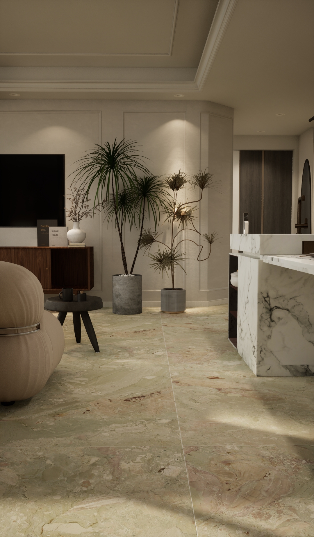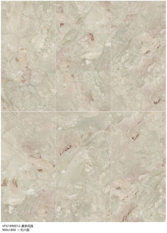 以柔和的粉绿调交织呈现,纹理如自然石材的晕染肌理,粉色与浅绿色相互交融,其间点缀着细微的金棕色泽,似春日里的繁花石景,细腻且富有层次。铺贴后为空间注入清新雅致的氛围,是打造轻奢风或自然系家居的独特选择,让空间在柔美中尽显艺术质感。