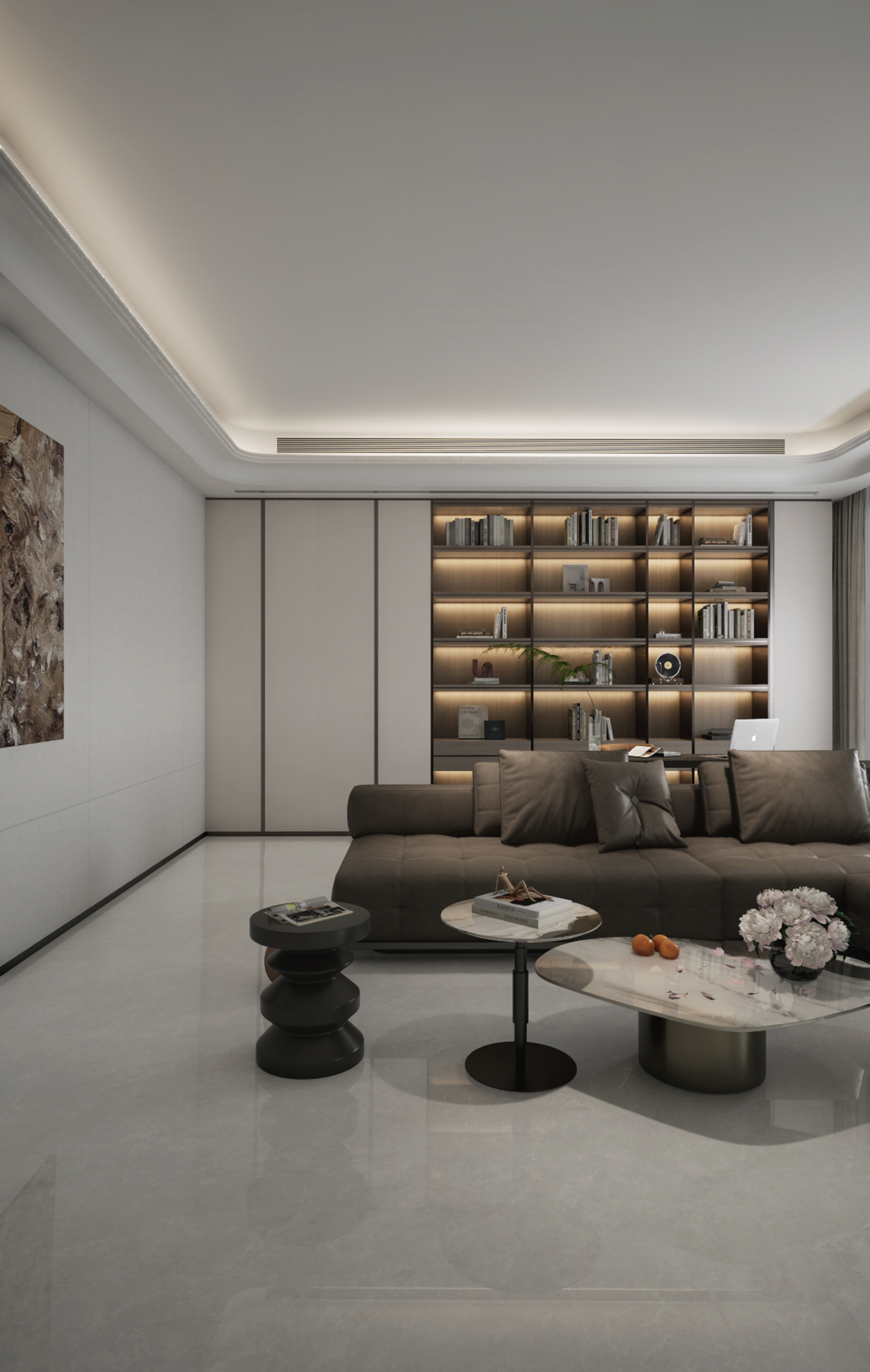 釉面呈现雅致的中灰色调,其上流淌着如云雾般自然柔和的深浅纹路。质地坚实,表面为细腻柔光质感,耐磨防滑且易于清洁。适用于客厅、书房等空间,能奠定静谧而有层次的视觉基调。灵感源于山间晨雾与水墨意境。其纹理如云气氤氲,在雅灰底色上自由舒卷,打破了平面的单调。