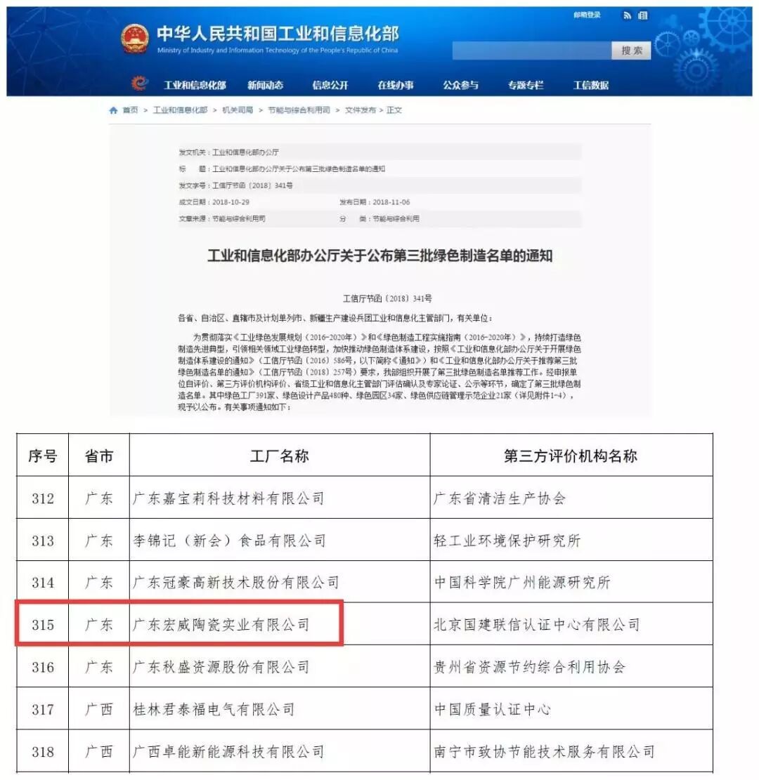 威尔斯陶瓷生产基地广东宏威陶瓷实业有限公司名列“绿色工厂”名单