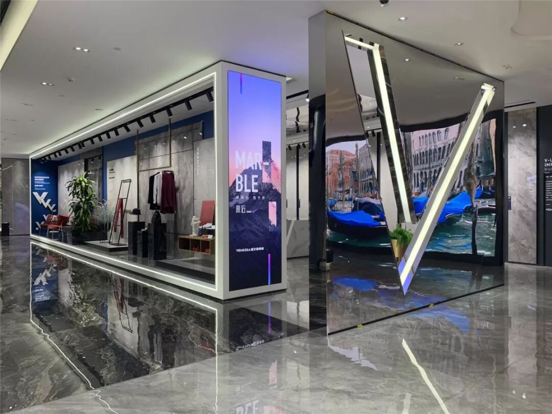 新出炉的“V-LIFE 印象”是延续威尔斯品牌文化与威尼斯水城文化相结合的高颜值展馆,它立足于威尔斯高品质产品,将未来科技、人文情怀、时尚潮流、绿色生态的设计理念注入空间;以核心技术高端产品大板系列( 900X1800mm )、原石系列( 600X1200mm ) 大规格等产品为主,运用现代科技手段、以及未来流行的展示设计手法呈现;通过设计的力量提升品牌高度,全新演绎V-LIFE现代美学风尚。