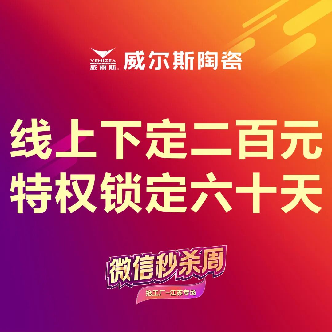 新冠疫情无疑是给陶瓷行业数字化进程按下了快进键,面对行业数字化的大趋势,威尔斯陶瓷总部积极推进终端零售和线上营销相结合的模式。在对线上营销模式进行不断探索的过程中,威尔斯陶瓷总部快速反应,推出【微信秒杀周】系列活动,由总部统一操盘、各地威尔斯陶瓷终端统一执行的省级大型线上联动活动;活动以实惠的价格、优质的产品与服务为亮点,形成高质量的线上抢购热潮。