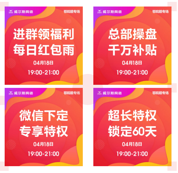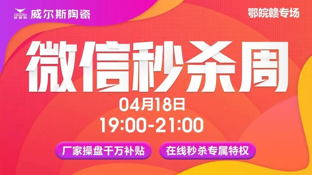 面对行业数字化的大趋势,威尔斯陶瓷总部积极推进终端零售和线上营销相结合的模式,重视线上流量端口,将原有的产品和服务匹配线上营销需求,通过多场次【微信秒杀周】系列活动,由总部统一操盘、各地威尔斯陶瓷终端统一执行的省级大型线上联动活动;活动以实惠的价格、优质的产品与服务为亮点,形成高质量的线上抢购热潮。