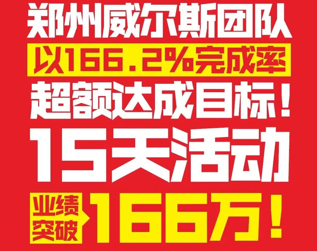5月10日,威尔斯总部再度携手郑州威尔斯团队,举行【超级品牌日】(第2季)促销活动,以火爆之势,席卷郑州市场,再创业绩高峰。15天活动销售业绩突破166万!以166.2%完成率超额达成目标!