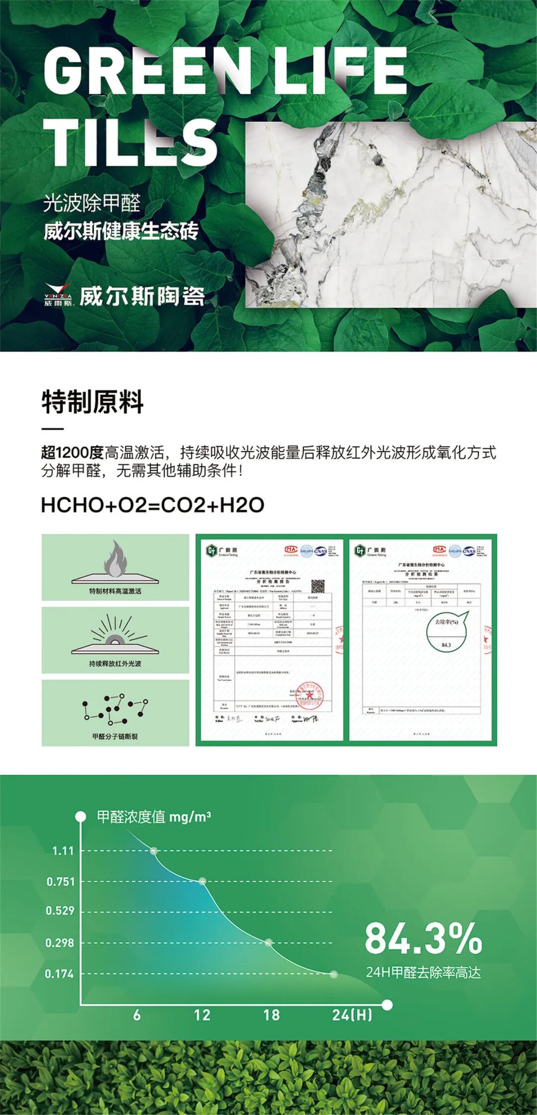 威尔斯健康生态砖的横空出世,标志着陶瓷行业“光波除甲醛”新技术的诞生。威尔斯研发团队和国际知名专家紧密合作,加入应用于航天航空领域的特殊新型材料,经1200℃高温煅烧激活,瓷砖可以吸收空间中的任何光波能量,持续稳定发射红外光波,高效快速降解甲醛、苯等有害物质,净化室内空气。与其他市面上的除醛方式不同,威尔斯健康生态砖从“原料、生产原理、净醛方式、降解效果”四大方面完美制胜,24小时内甲醛去除率高达84.3%!