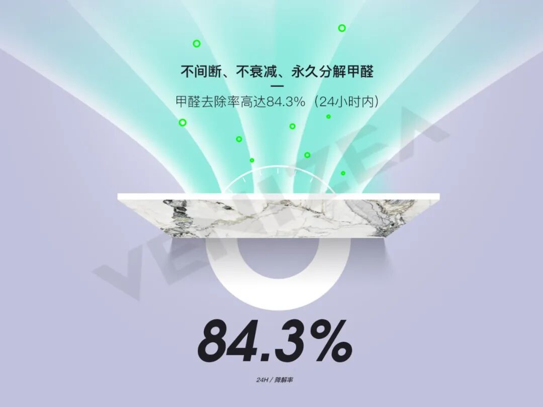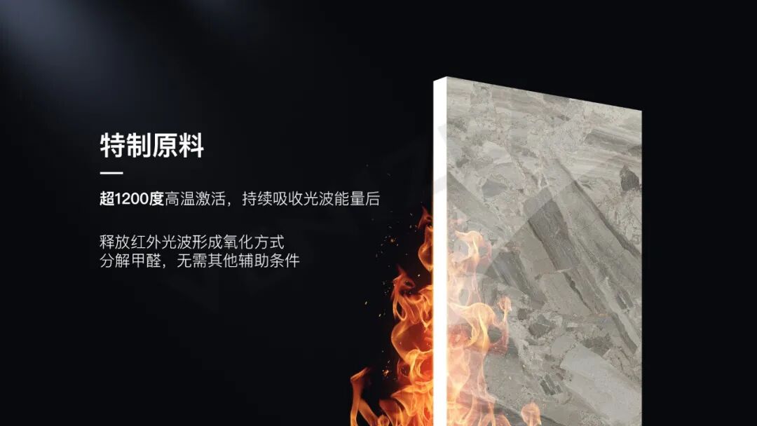 威尔斯研发团队和国际知名专家紧密合作,加入特殊新型材料,经1200℃高温煅烧激活,瓷砖可以吸收空间中的光波能量,持续稳定发射红外光波,高效快速降解甲醛、苯等有害物质,净化室内空气。