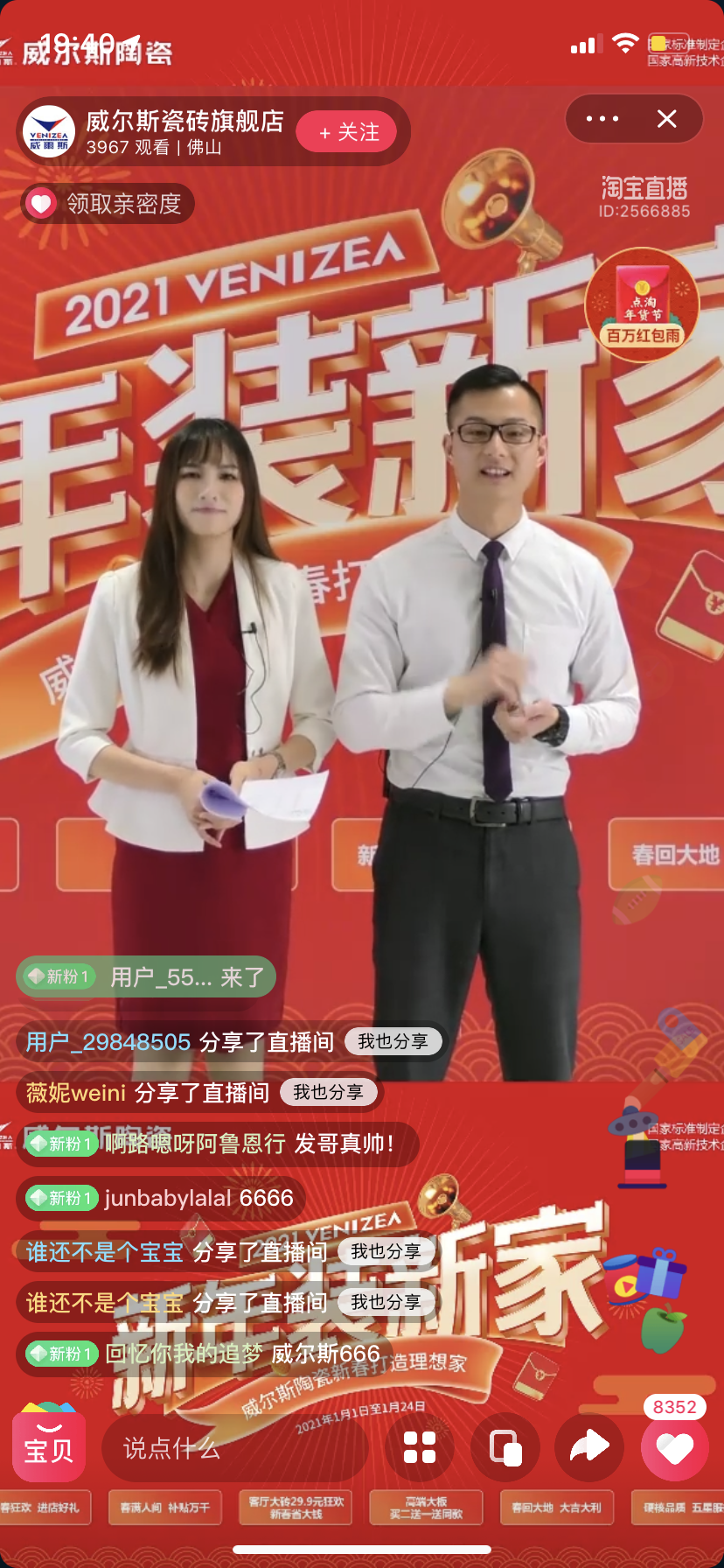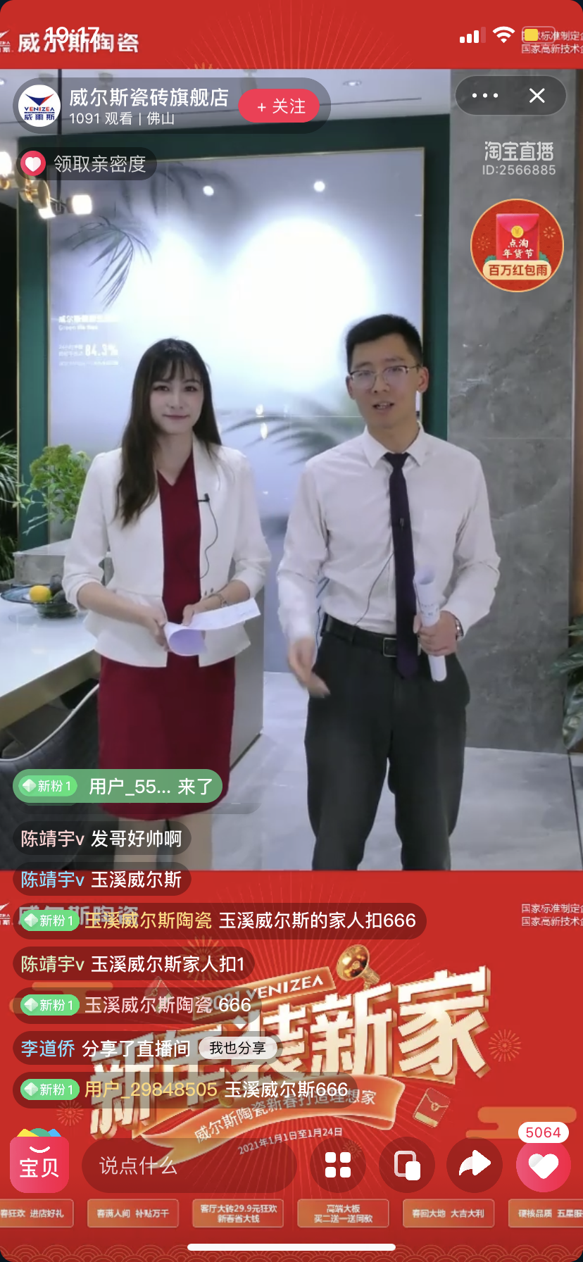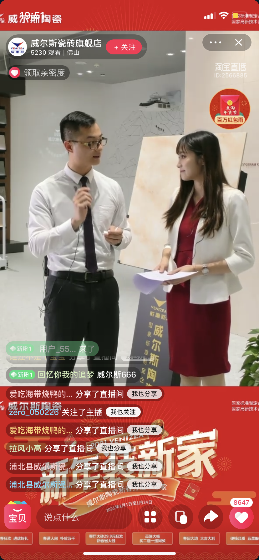 1月22日晚,威尔斯陶瓷天猫旗舰店“新年装新家”迎新春送福利总部直播圆满收官!众多网友参与直播互动点赞,掀起一番新春狂欢热潮。