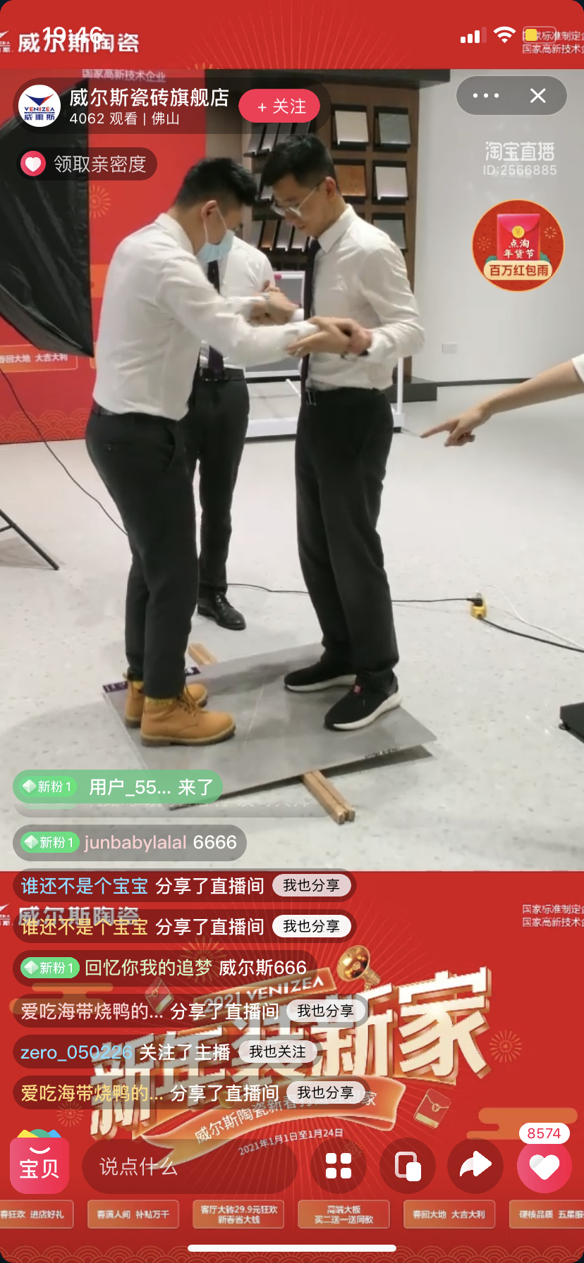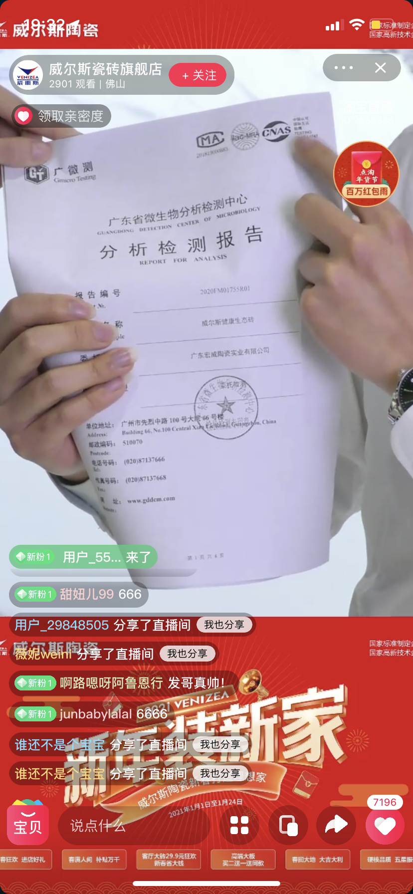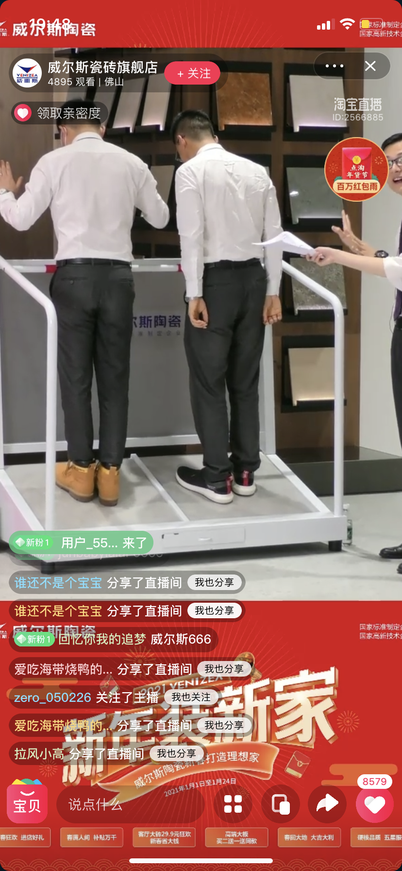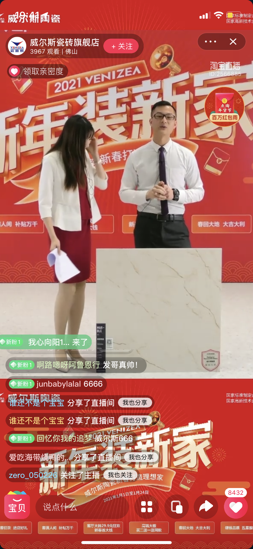 直播间精彩不断,活动圆满收官,威尔斯陶瓷时刻心系消费者,倾力打造好品质、高端时尚优质品牌。
