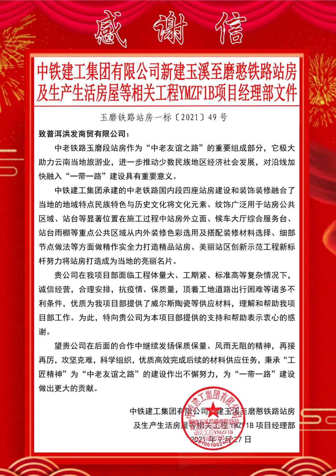 在云南省“一带一路”的建设过程中,云南普洱威尔斯陶瓷参与中铁建工集团承建的中老铁路的相关工程项目,凭借强大的品牌实力和优异的产品品质,于今年五月获得在“一带一路”工程昆曼高铁的普洱站、宁洱站、西双版纳站、磨憨站等4个车站的工程项目签约合作。在双方合作供货及使用过程中,威尔斯以高品质的质量、高标准的工作和服务,赢得了中铁建工集团的认可。该工程所属部门向云南普洱威尔斯陶瓷提供的支持和帮助致以衷心的感谢,并发来《感谢信》。