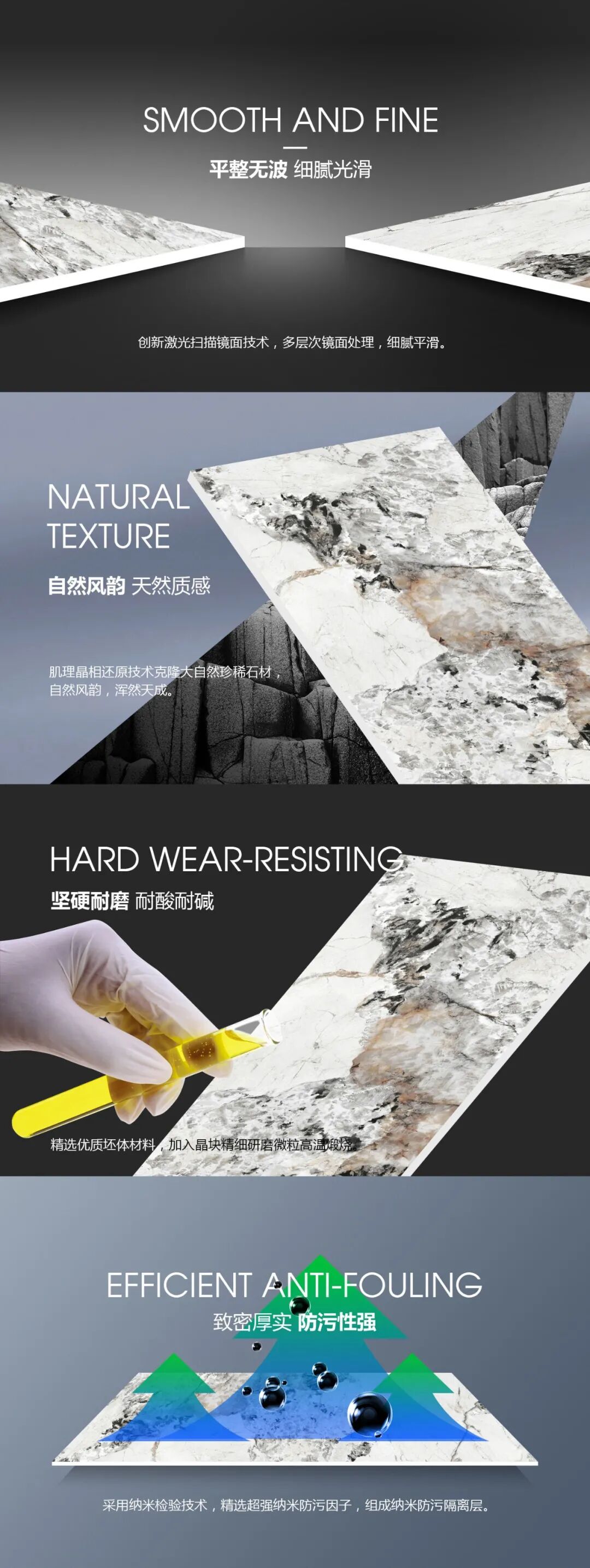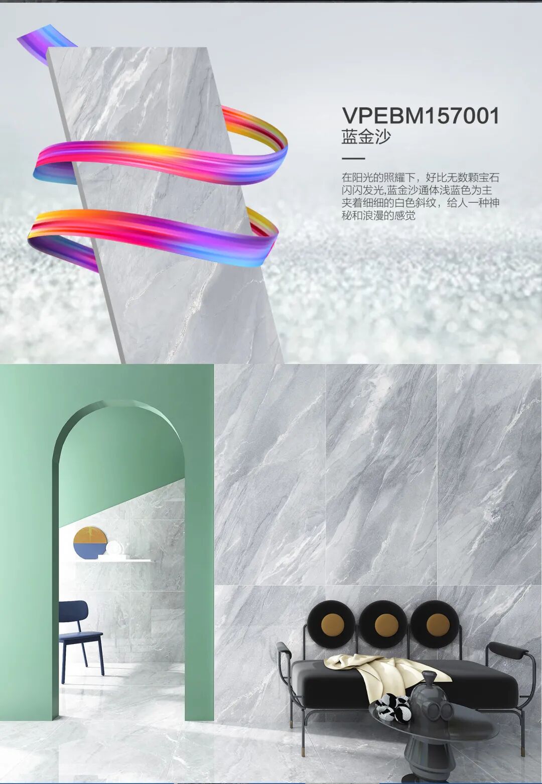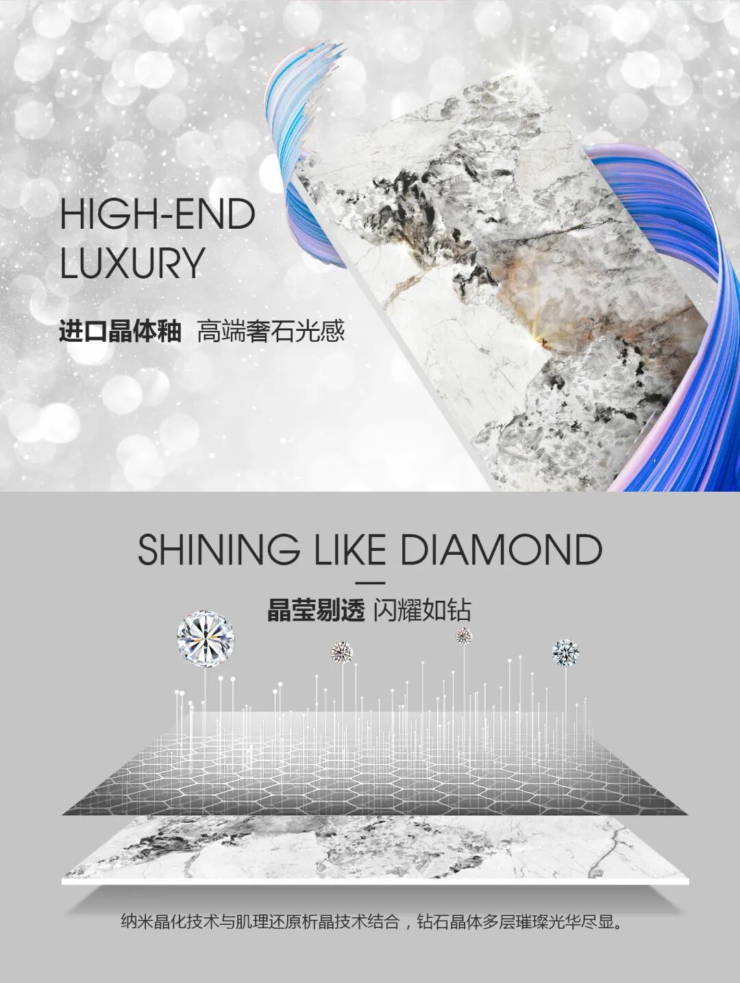 威尔斯晶钻釉,高密度奢石高亮表面处理,大理石矿物解理结构产生的折射视觉,打造出“晶钻”般珍稀玲珑剔透的质感和丰富多面的纹理效果,使产品温润优雅,璀璨动人。