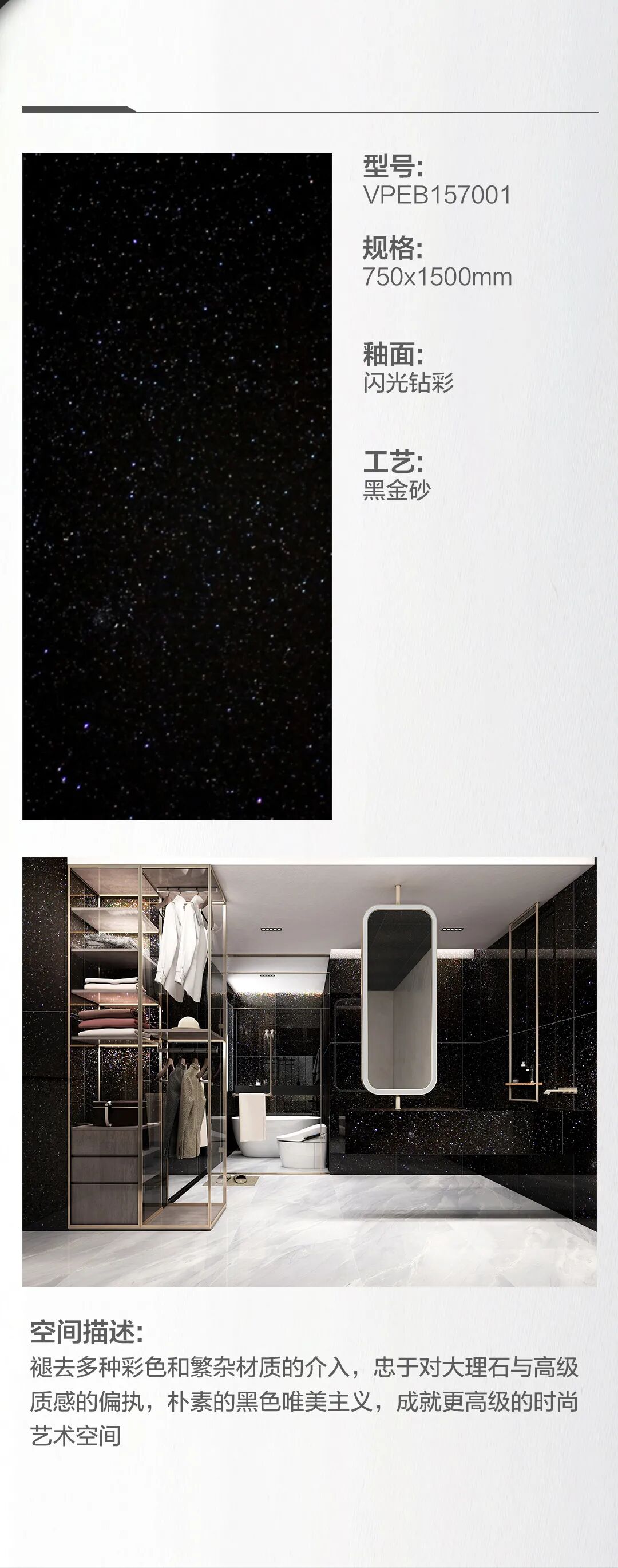 黑色的坯体如夜空般深邃而神秘,点点金砂如夜空中的星星在灯光照射下熠熠生辉,威尔斯“黑金砂瓷砖”完美复刻天然石材大美天成的外观,承袭天然石材深邃典雅的神韵,硬度、耐磨度、防污等各项产品使用性能均超越天然石材。