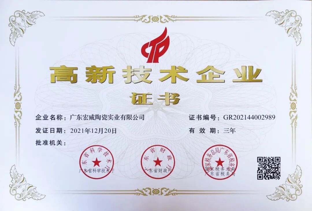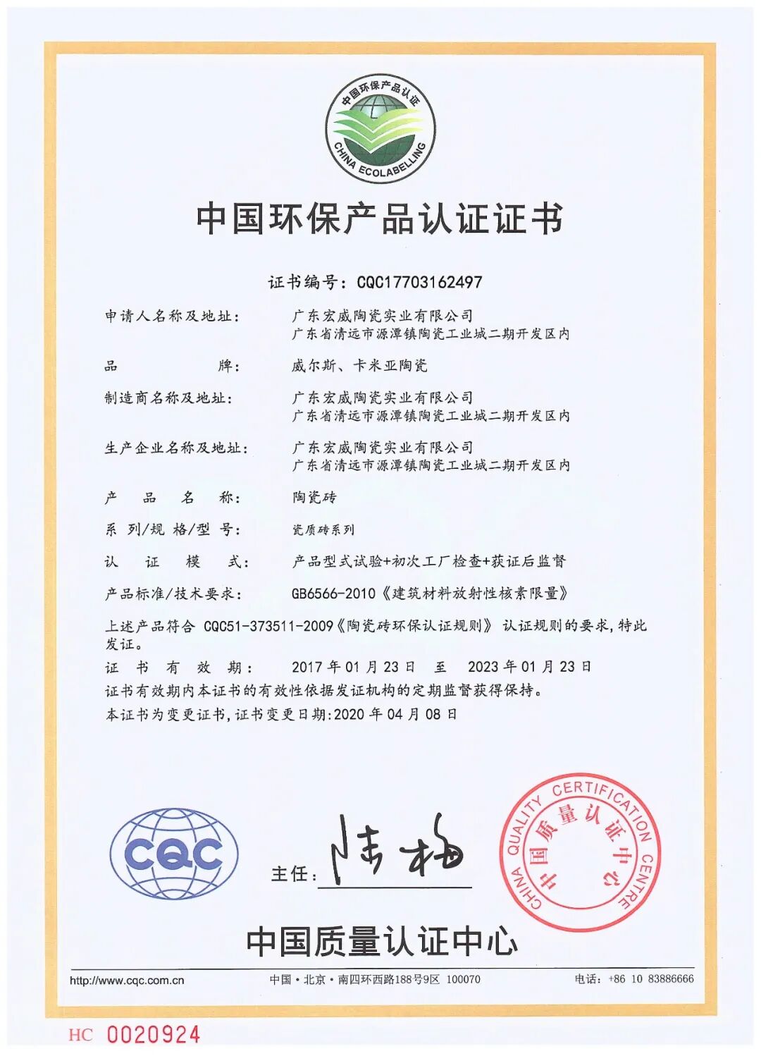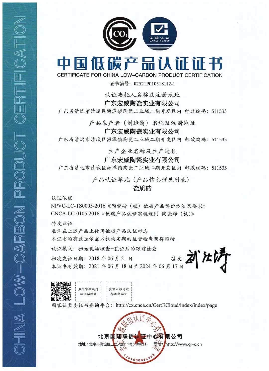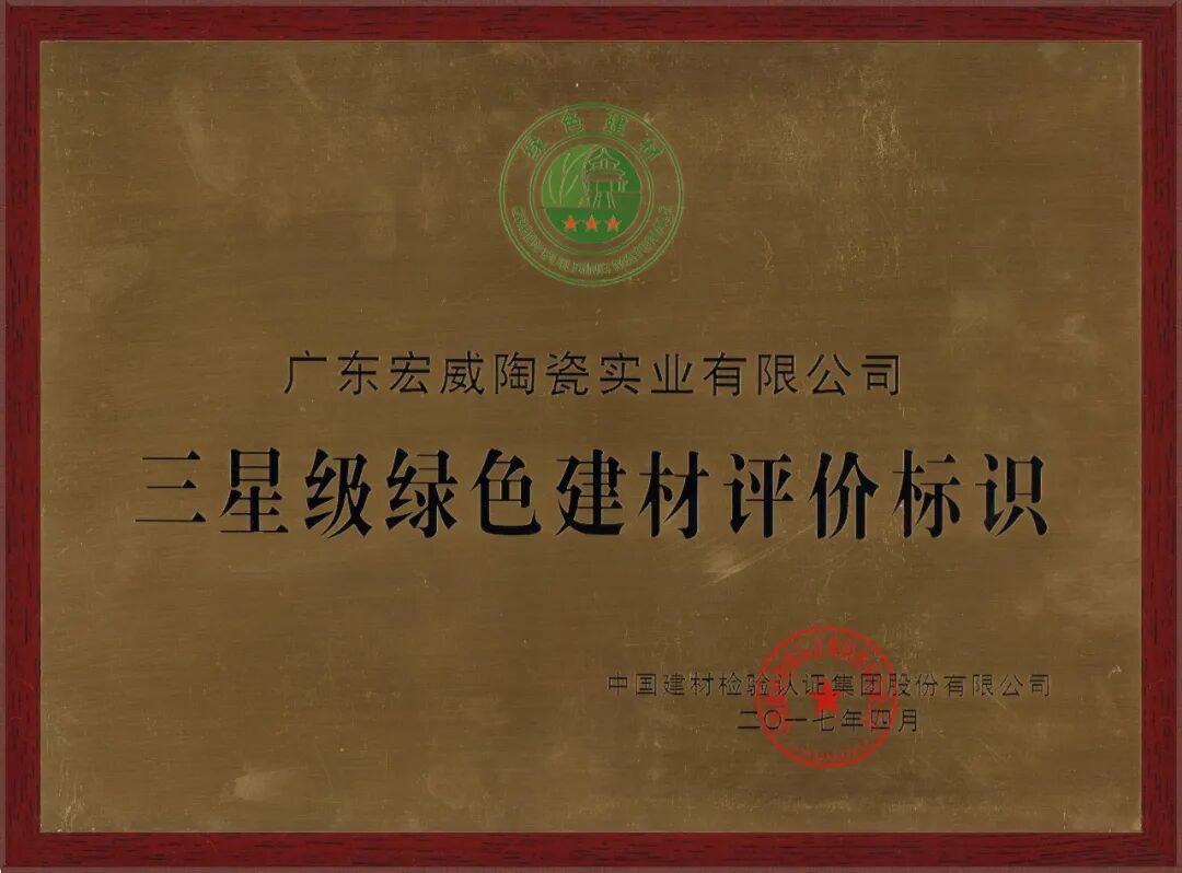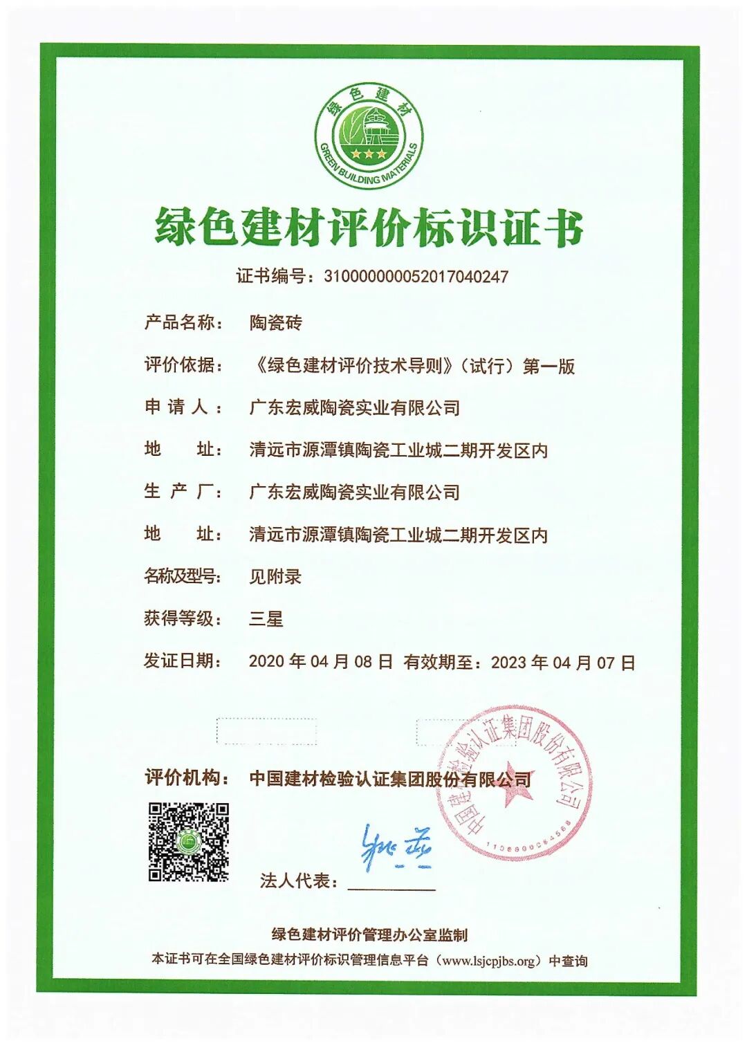 经过评审,广东宏威陶瓷实业有限公司凭借强大的绿色生产实力,成功入选首批“广东省绿色建材下乡活动入库企业目录",并得到主办方颁发荣誉证书认证。