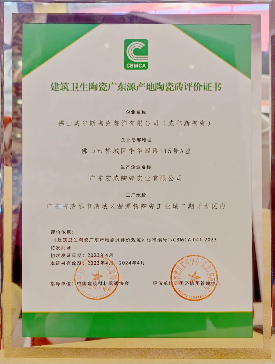 4月26日,被誉为“行业两会”的“2023第十二届中国陶瓷卫浴品牌与酒店业合作峰会暨第九届全国陶瓷/卫浴经销商大会”在浙江杭州盛大举行,威尔斯陶瓷凭借雄厚的品牌实力与卓越的产品品质,以及企业的强大生产实力,斩获2023年度“广东源产地陶瓷砖”重磅级荣誉称号。