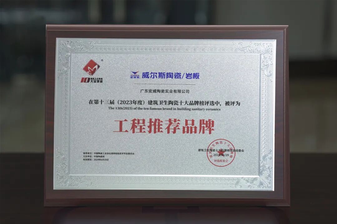2023年“中国建筑卫生陶瓷十大品牌”颁奖大会的品牌榜单,由专家推荐和网络投票产生。威尔斯陶瓷赢得了网友和专家评审团的一致认可,斩获2023年度多项重磅级荣誉称号。