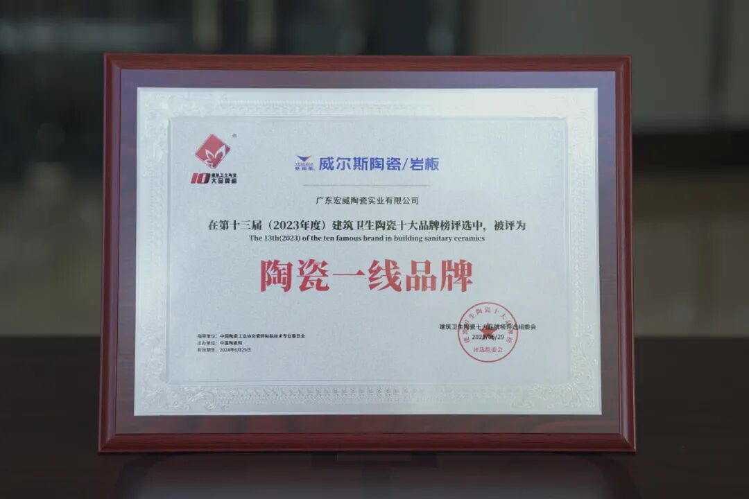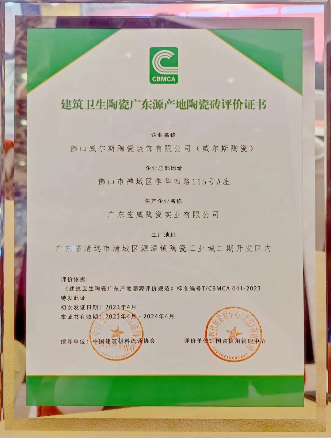 威尔斯陶瓷凭借深受行业内外的认可和支持,赢得了网友和专家评审团的一致认可,凭借广东宏威陶瓷实业有限公司的强大生产实力,斩获2023年度“广东源产地陶瓷砖”重磅级荣誉称号。