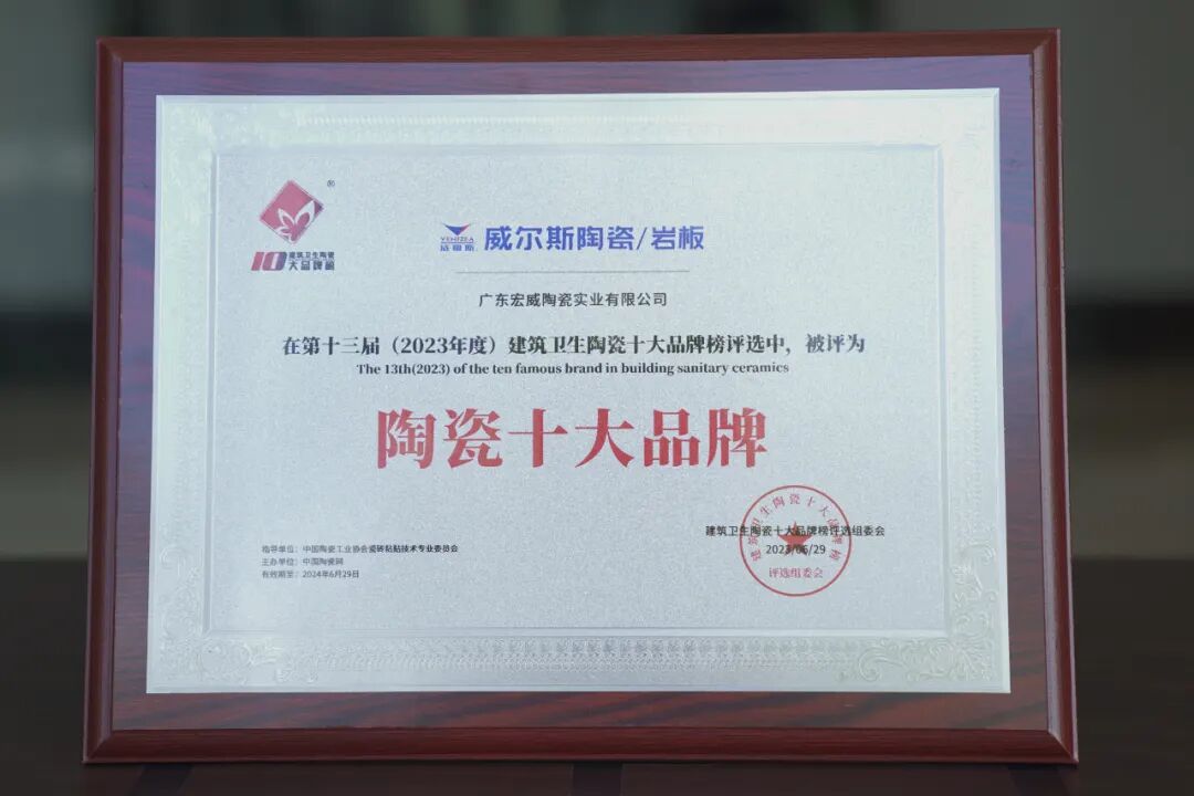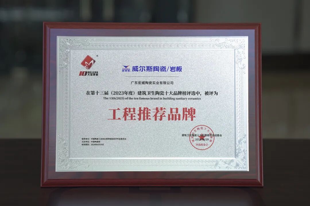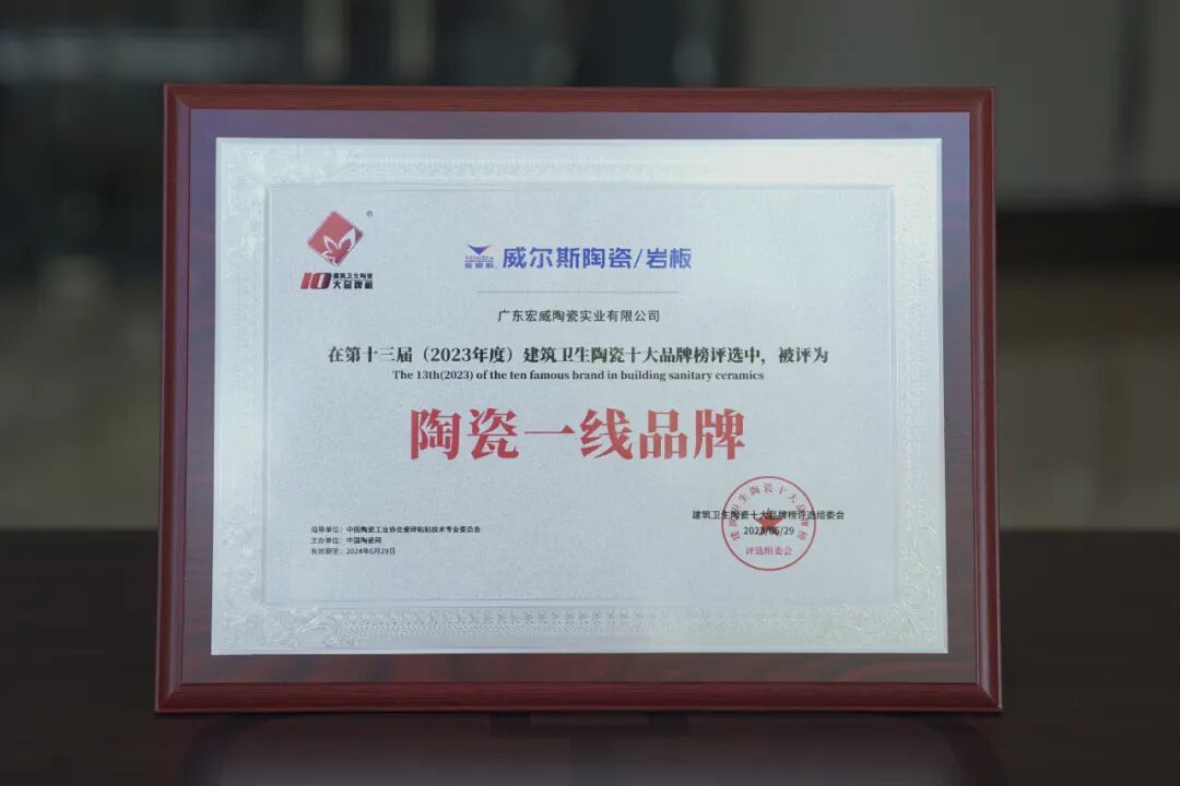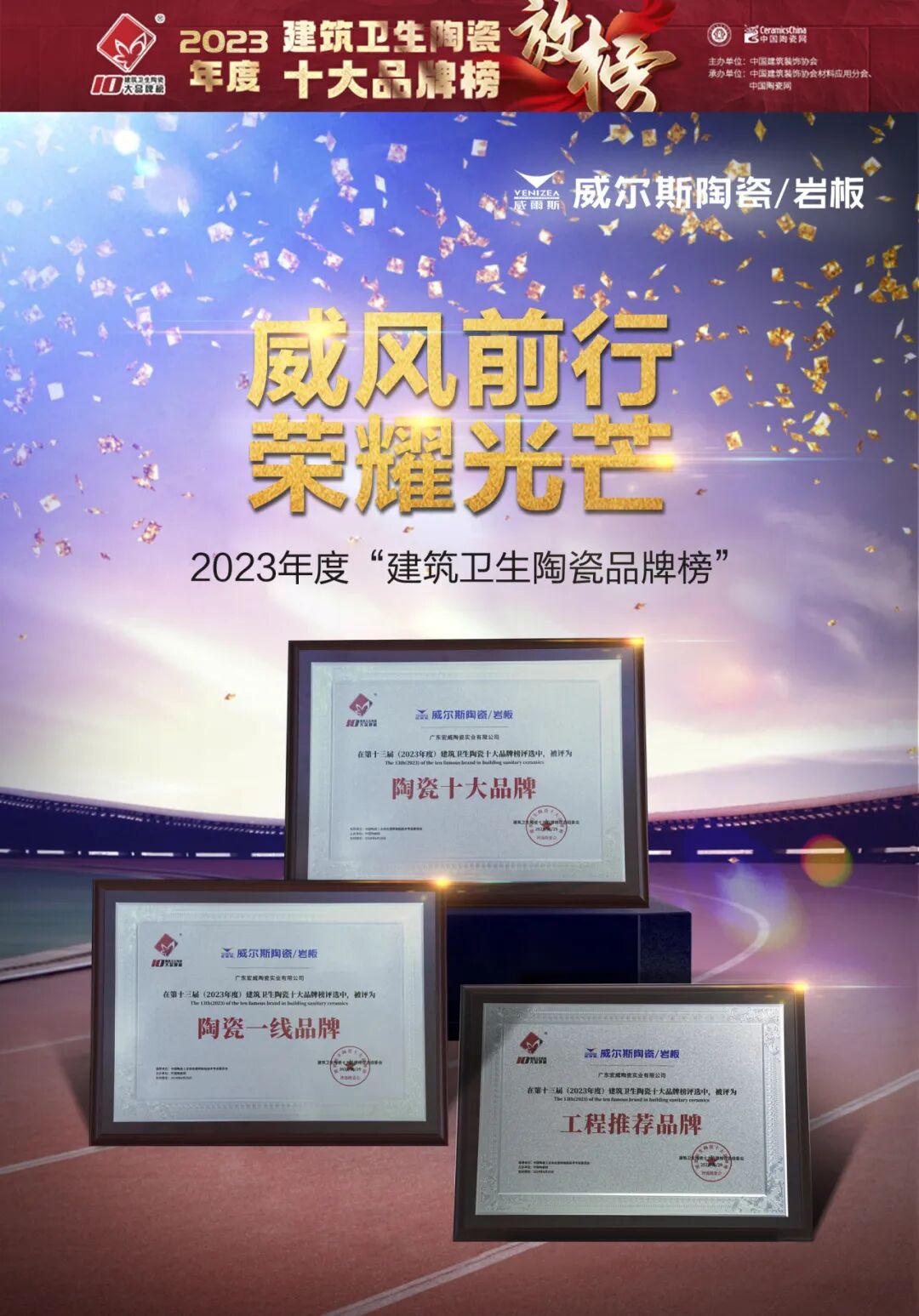 2023年6月,2023年“中国建筑卫生陶瓷十大品牌”颁奖大会的品牌榜单,由专家推荐和网络投票产生。威尔斯陶瓷赢得了网友和专家评审团的一致认可,斩获2023年度多项重磅级荣誉称号。