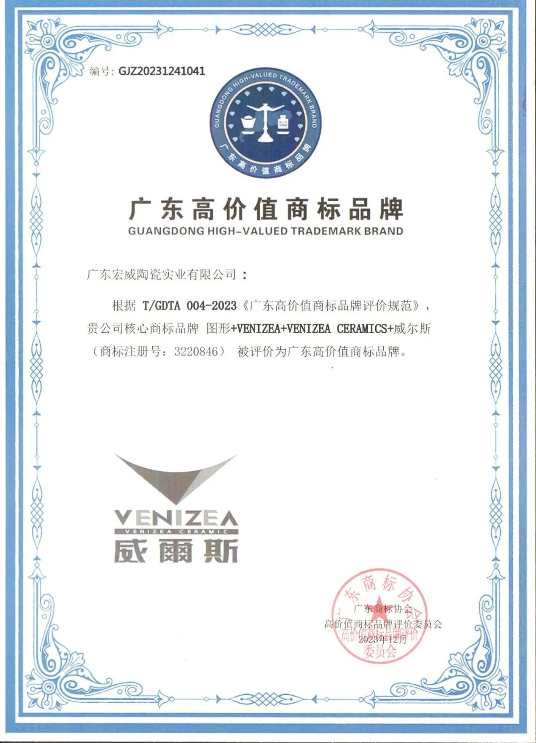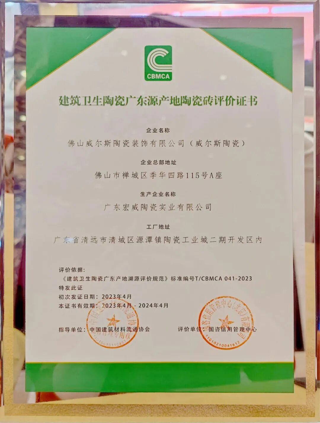 2023年4月,根据团体标准《建筑卫生陶瓷广东产地溯源评价规范》(标准编号为T/CBMCA 041-2023),首批“广东源产地陶瓷砖”名单出炉。威尔斯陶瓷顺利通过标准审核,荣获“建筑卫生陶瓷广东源产地陶瓷砖评价证书”。