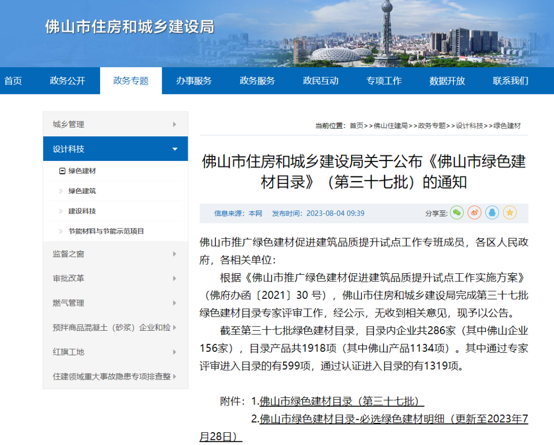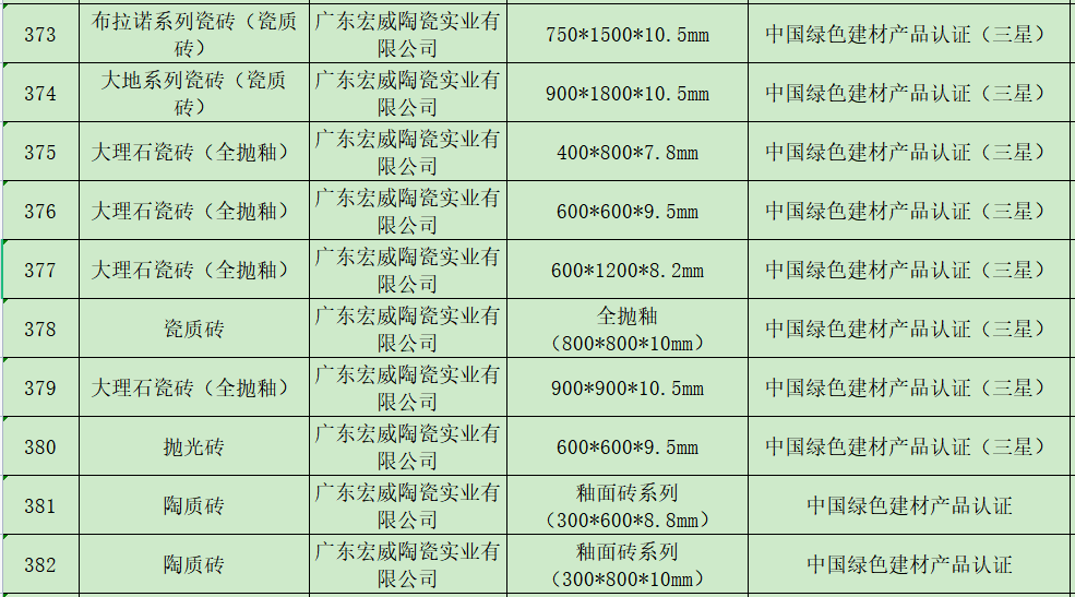 2023年8月,佛山市住房和城乡建设局公布了第三十七批绿色建材目录。佛山市住建局根据此前公布的绿色建材编制了《佛山市绿色建材目录-必选绿色建材明细》和《佛山市绿色建材目录-可选绿色建材明细》,威尔斯陶瓷包括布拉诺系列750×1500mm、大地系列900×1800mm、大理石系列、瓷质抛光砖系列、玉灵璧釉面砖系列等产品上榜《佛山市绿色建材目录-必选绿色建材明细》。