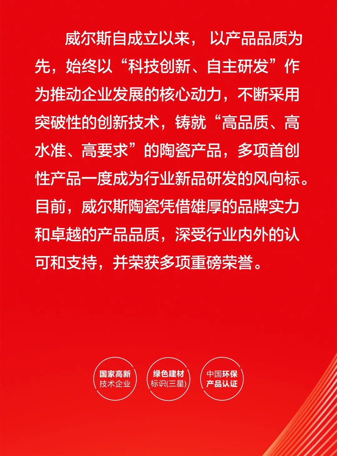 威尔斯陶瓷凭借雄厚的品牌实力和卓越的产品品质,深受行业内外的认可和支持,荣获多项重磅荣誉。