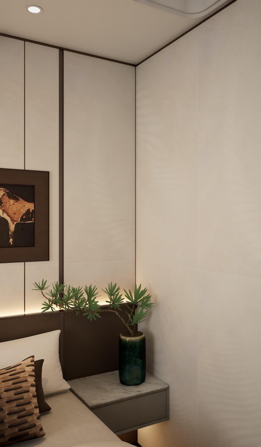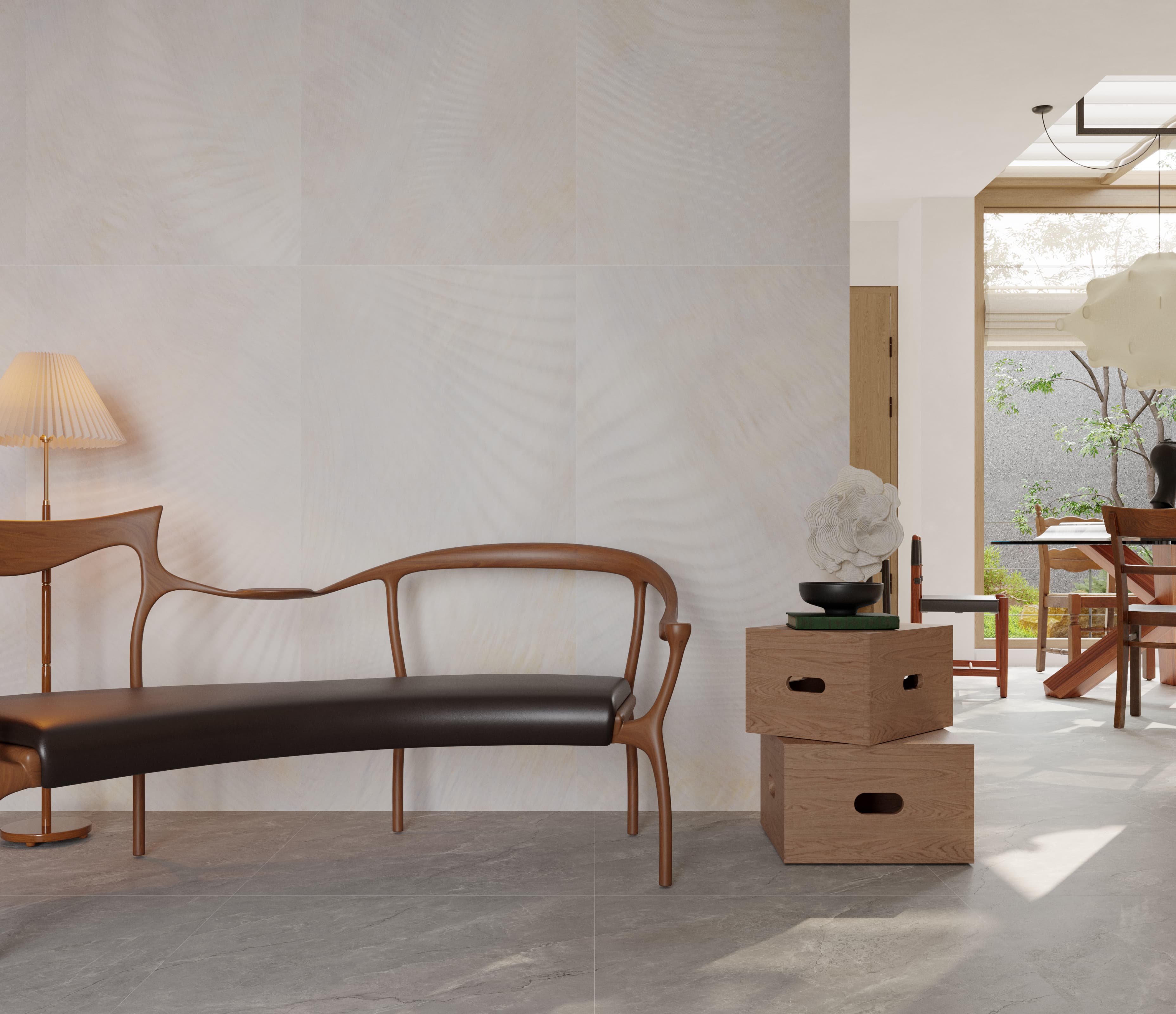 以清透柔和的月白色为底,纹理如轻烟漫卷、似柔波涟漪,细腻的肌理宛若香云纱面料的天然褶皱,在光影下流转出雅致的韵律。每一片都似独有的艺术织锦,将东方织物的温婉质感凝于砖面,为空间铺就出如诗般的月白意境,让家居满溢着雅致且灵动的东方美学气息。