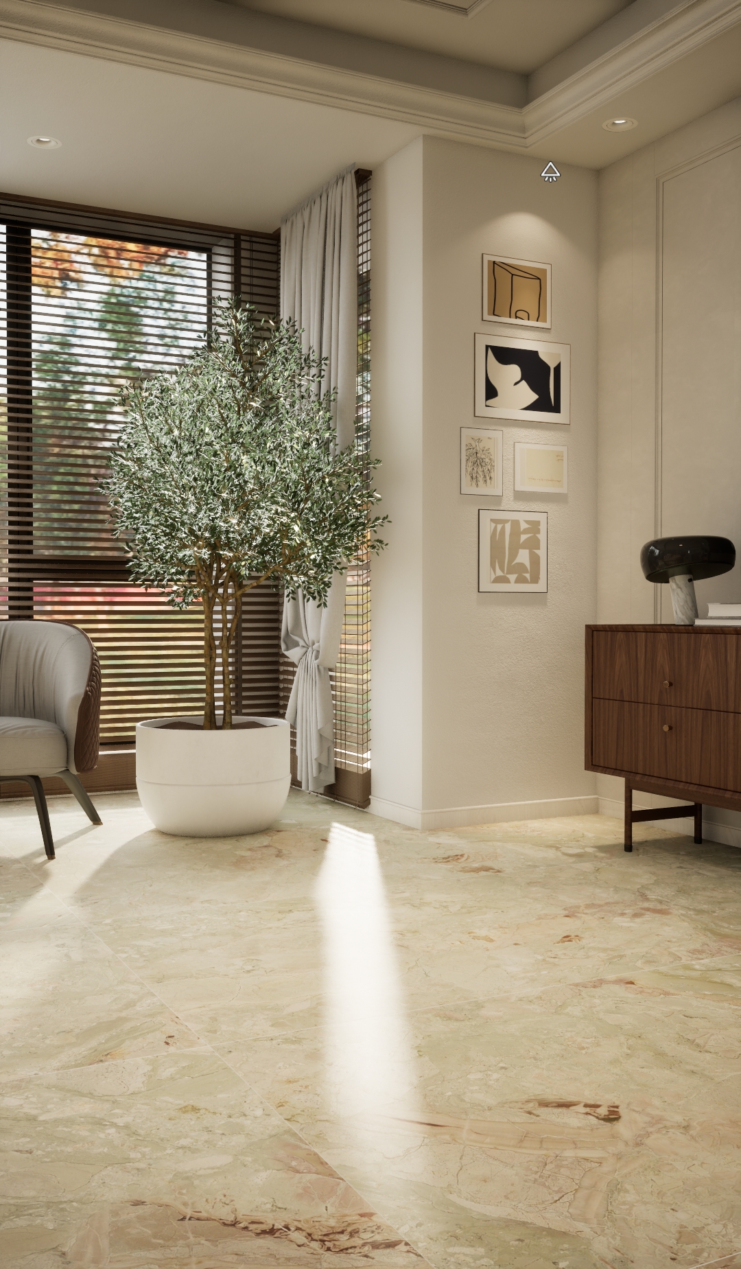 以柔和的粉绿调交织呈现,纹理如自然石材的晕染肌理,粉色与浅绿色相互交融,其间点缀着细微的金棕色泽,似春日里的繁花石景,细腻且富有层次。铺贴后为空间注入清新雅致的氛围,是打造轻奢风或自然系家居的独特选择,让空间在柔美中尽显艺术质感。